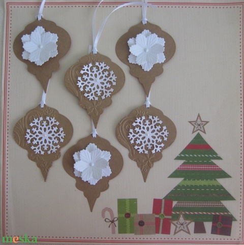 Karácsonyi ajándékkísérő - karácsonyfadísz - kraft karton - hópehely - csoportajándék - egyedi ajándékkártya - emlék