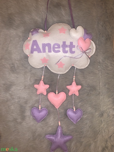 Felhő filc névtábla szívekkel, falidísz , ajtódísz , babaszoba dekoráció