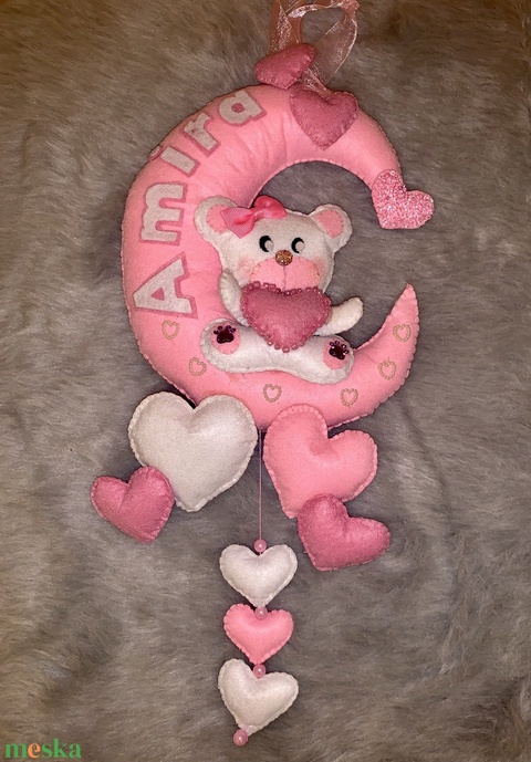 Fehér macis filc névtábla, falidísz, babaszoba dekoráció