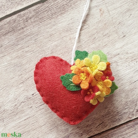 Gyapjúfilc szív dísz virágokkal – piros szív apró sárga, narancs és piros virágokkal