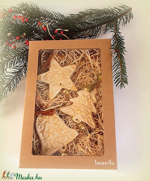 agyag, máz, kartondoboz, szalag, fémharang, kerámia