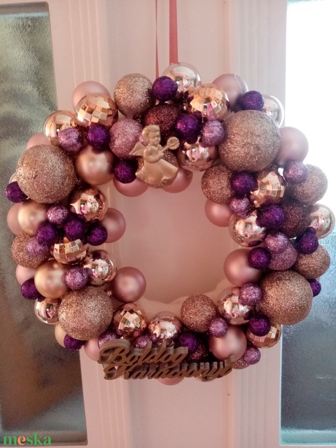 - Anyaga: koszorú alap, gömb díszek, szalag