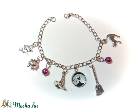 Boszi boszorkány fekete macska üveglencsés karkötő charmokkal lila gyöngyökkel