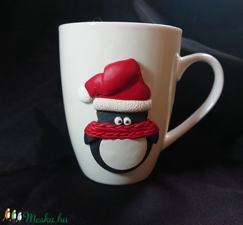 Pingvin mintás bögre gyurma díszítéssel Mikulás Karácsony ajándék