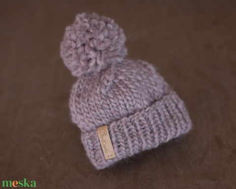 Világos bézs, kézzel kötött felhajtós pom-pom sapka 0-3 hó készletről