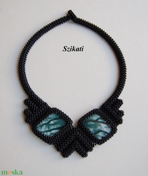 Fekete fémmentes gyöngyfűzött nyakék mentazöld kabosonnal