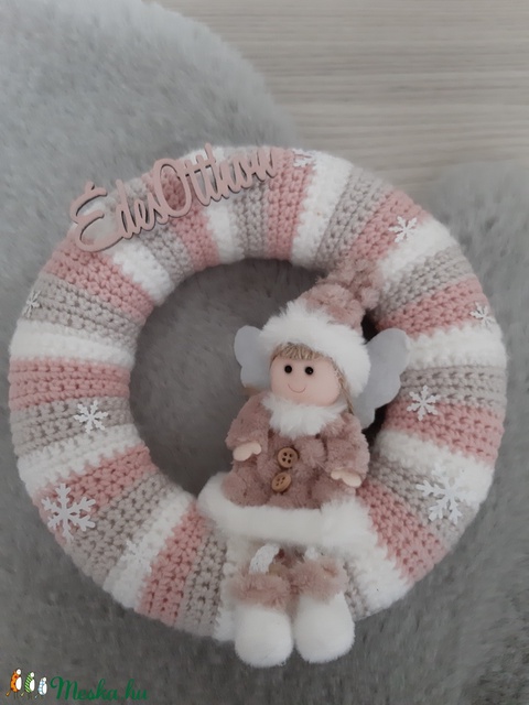 - Anyaga: hungarocell koszorúalap, puha kötőfonal, angyalka dekoráció, fa felirat, tépőzár