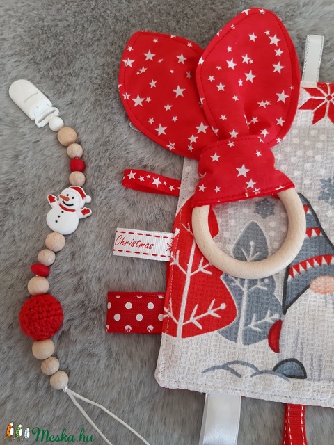 - Címke rongyi: egyik oldalán manó mintás, másikon egyszínű piros 100% pamut darázs textilből készült rongyi, különleges, változatos textúrájú szalagokkal, farkasfoggal. Mérete: szalagokkal kb. 27 cm, anélkül kb. 20 cm.