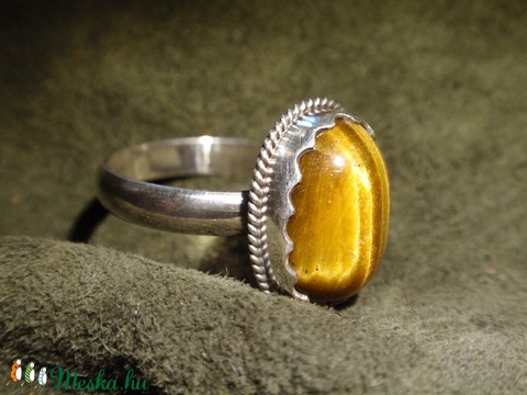 Egyköves, tigrisszem köves gyűrű,tokos foglalatban sodrott dróttal keretezve.A kő féldomború.