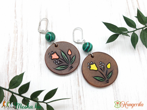 Aszimmetrikus mintás korong bőr fülbevaló malachittal