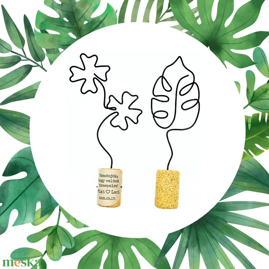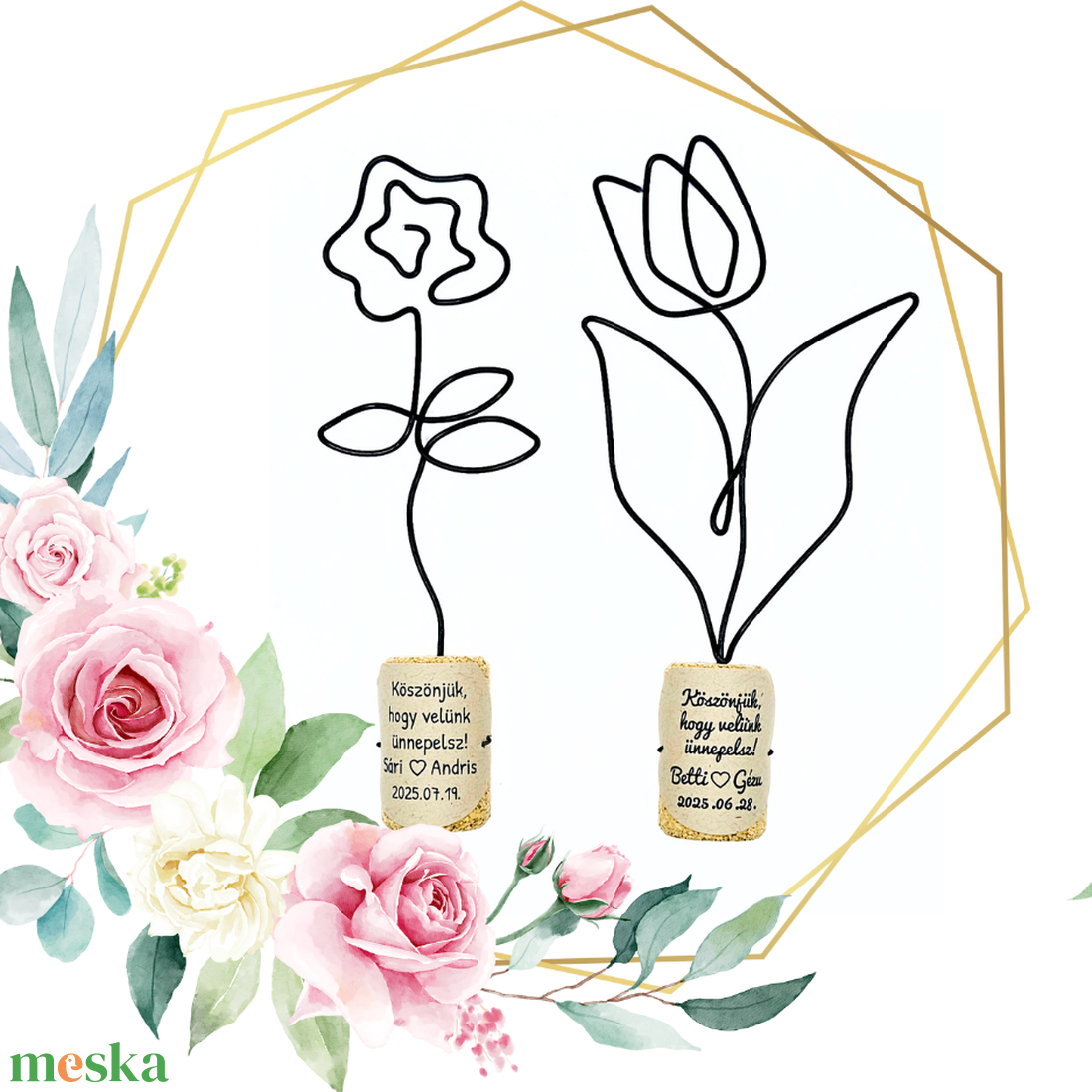 Virágos esküvői köszönetajándék / köszönőajándék drótból, matricázott parafadugóban - egyedi ajándékötlet vendégeknek