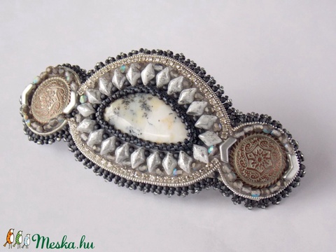 gemduo, delica, miyuki kása gyöngy, dendrite opal, cseh csiszolt, francia drót, antikolt fém gomb, arrow, strassz lánc