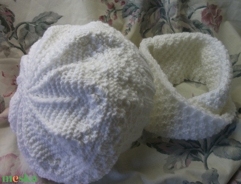 Fehér, kötött sapka, körsál együttes kicsi lánynak
