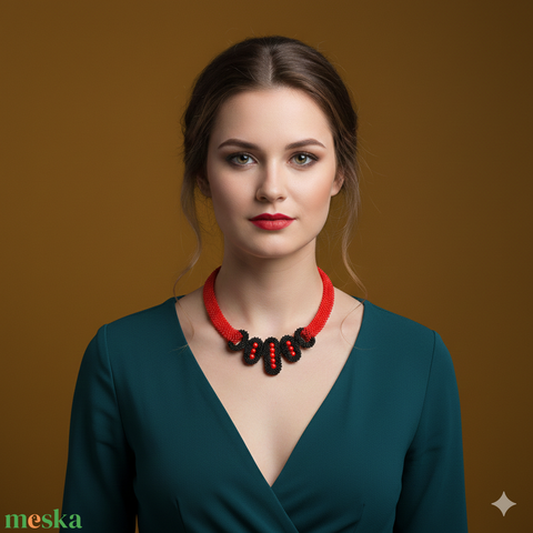 Piros - fekete fémmentes gyöngyfűzött nyakék