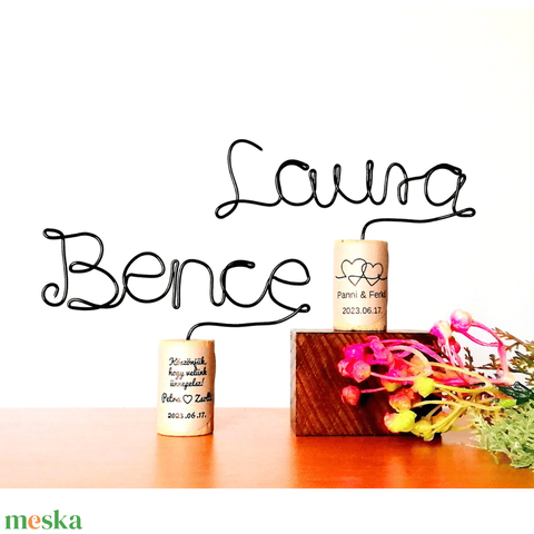 Minden név drótból hajlított és stílusosan parafadugóba rögzítve várja vendégeidet az asztaloknál.