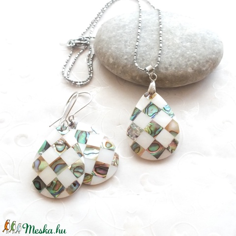 Intarziás gyöngyház - pávakagyló csepp nyaklánc és fülbevaló szett