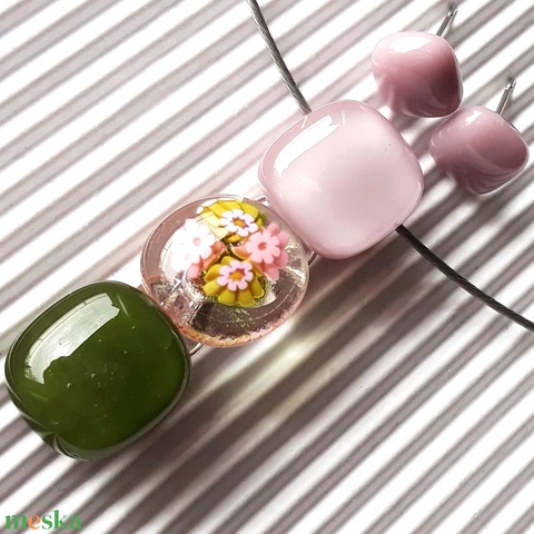 Romantikus vintage virág-gyöngysor üveg medál + sápadt rózsaszín fülbevaló orvosi fém bedugón, millefiori, üvegékszer