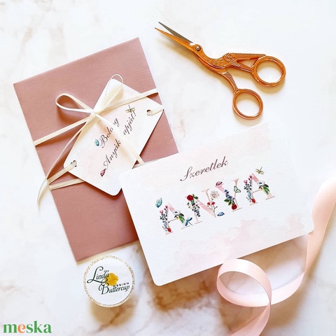 - Anyaga: 250 gsm vászon mintáju fehér művész papír, extra mínőségű piros boríték, celofán, canon tinta