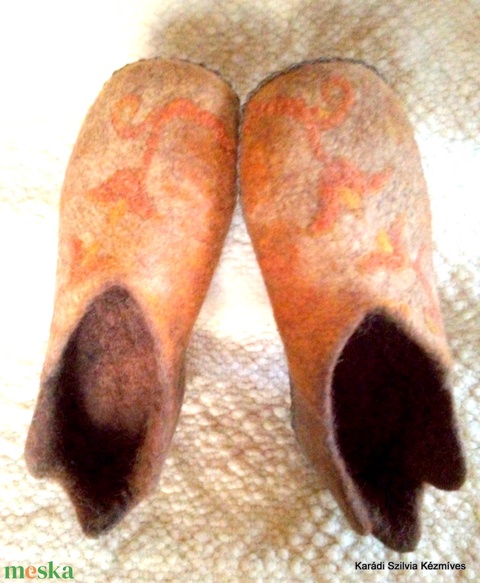 A gyapjút festem, tervezem, formázom, gyúrom, felnőtt méretekben rendelhető. A kész papucsot cipésztől örökölt kaptafán szárítom. A teljes száradás után kézzel varrom fel a bőrt a talpára, hogy minél tovább bírja a strapát.