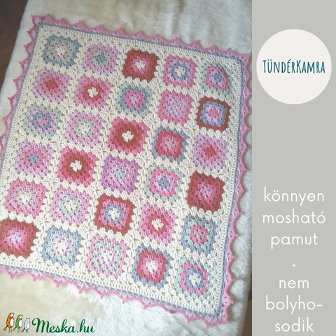 Baba takaró - horgolt nagyinégyzetes - pink fehér pamut - kötött babatakaró