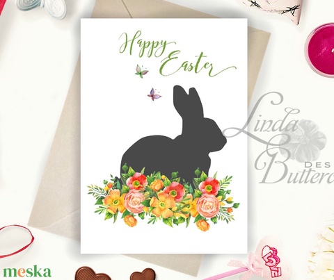 Húsvéti képeslap, Húsvéti dekoráció, Húsvét, Nyuszi, Nyúl, Tavaszi virágok, ibolya, pillangó, lepke, Tavasz