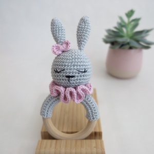- Anyaga: 100% pamutfonal, műanyag biztonsági szem, vatelingolyó töltet, csörgőgolyó, natúr kezeletlen fakarika