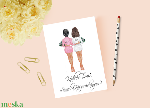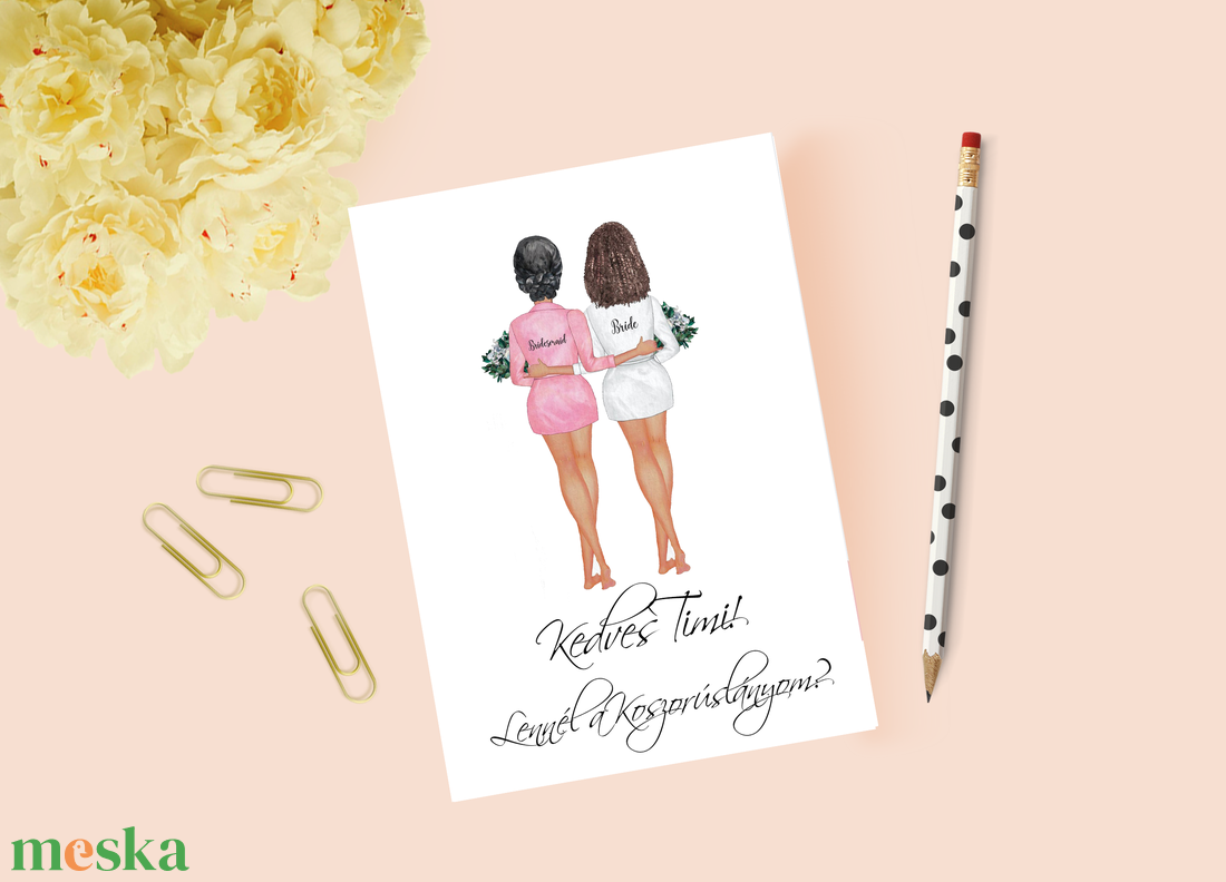 Rajzolt koszorúslány-felkérő kártya borítékkal, tanúfelkérő, esküvőre
