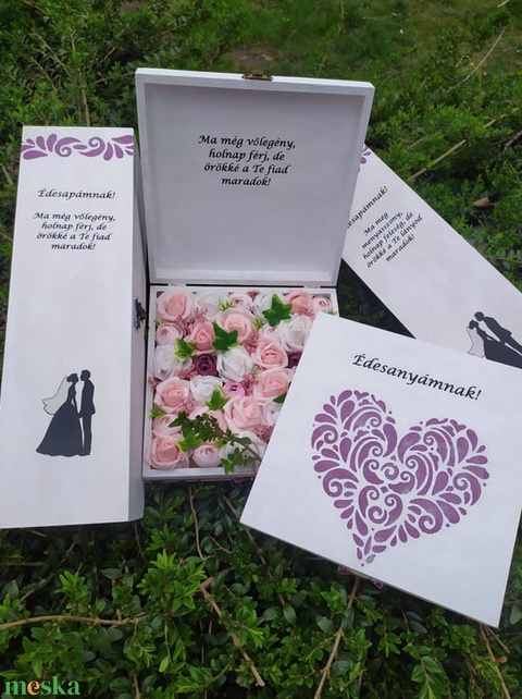 Szülőköszöntö bortartó és virágdoboz, mályva