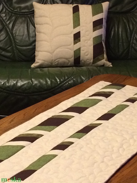 Zöld-natúr asztalterítő, patcwork díszpárna, párnahuzat, modern, mozaik mintás stílusban
