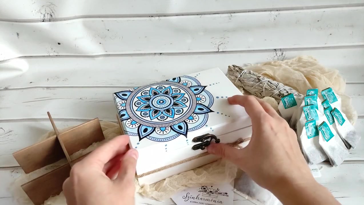 - Anyaga: ragasztó, vízbázisú lakk, akrilfestékek, fadoboz, fapác, tinta, fa, kenderzsineg