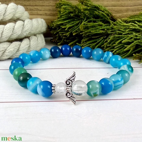 Kék csíkos sávos achát ásvány karkötő roppantott hegyikristály angyalkával