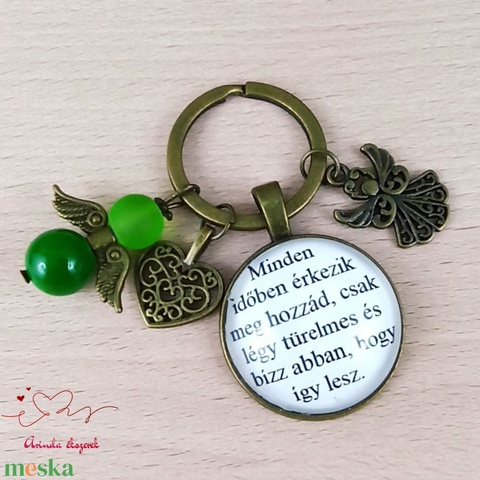 Minden időben érkezik feliratos üveglencsés kulcstartó táskadísz zöld angyallal