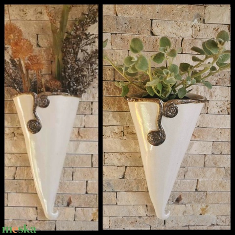 Ültessünk virágot! :) Ezeket az egyedi kis díszes virágtartókat is fehér agyagból szabadkézi formázással készítettem.A virágtölcsért második égetés előtt szép gyögyfehér és óarany mázzal ajándékoztam meg.Száraz virágot illetve élő kis virágot is lehet bele ültetni / ami nem túl sok föld igényű/.Méretei:29x15cm (a legszélesebb részeken). .Az ültethető nyílás pedig kb 13x8 cm átmérőjű.Boltunkban minden alkotás kész termék ezért akár azonnal megvásárolható .