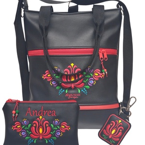 - Anyaga: textilbőr, pamutvászon, fémkellékek, cipzár, heveder, merevítő
