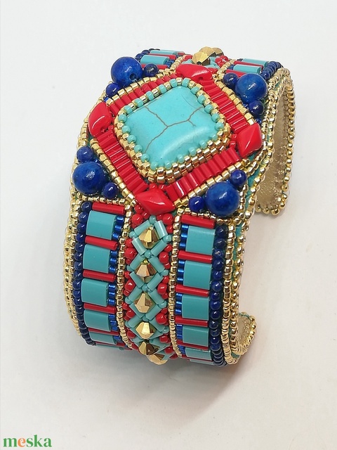 rekonstruált türkiz kaboson, japán kása és cilinder gyöngyök, cseh formagyöngyök, japán tila gyöngyök, preciosa bicone gyöngy, lapis lazuli golyó ásványgyöngyök, textilbőr, alumínium