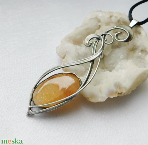 A medál Tiffany technikával készült citrin, réz és ólommentes, ezüsttartalmú ón felhasználásával. A diszítés szintén saját készítésü, nem tartalmaz gyári elemeket. A fémrészt óezüstre patináztam és lelakkoztam, hogy sokáig szép maradjon.