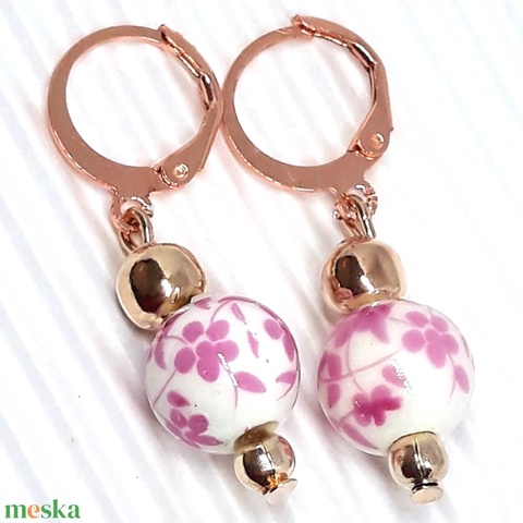 Babarózsa virág rózsa-aranyban porcelán gyöngy fülbevaló NEMESACÉL akasztón, gyöngyékszer