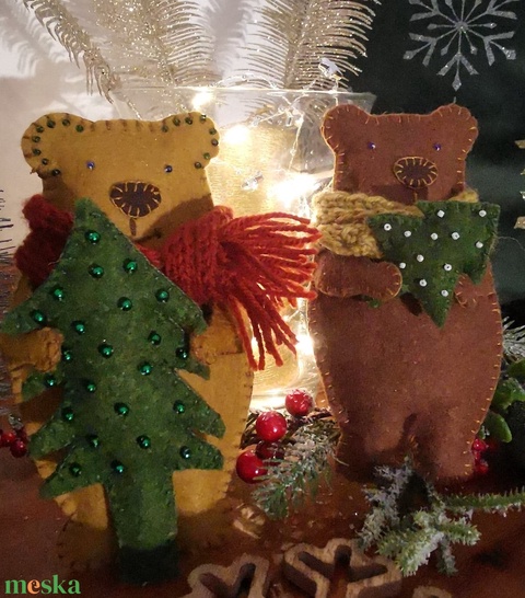 Karácsonyi macik gyapjúfilcből karácsonyfával, kötött sállal (4490 Ft/db)