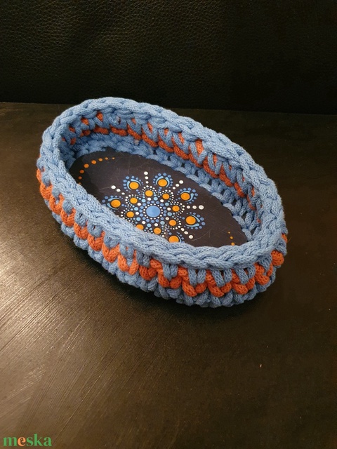Kék-narancs színű horgolt kosár mandala díszítéssel