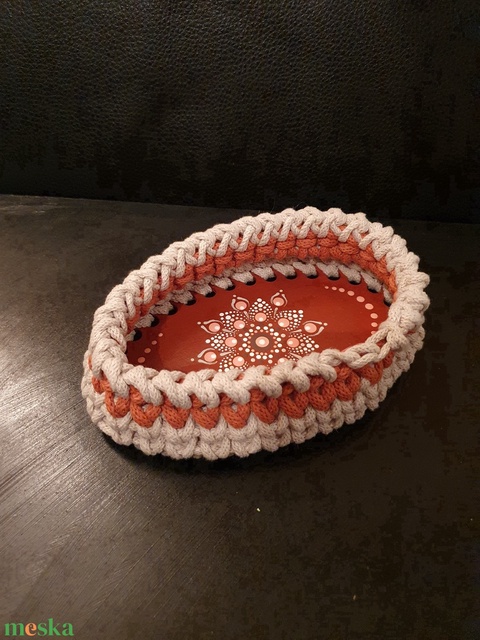 Barna- bézs színű horgolt kosár mandala díszítéssel