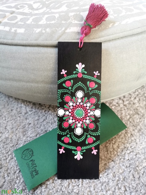 Fa alapra festett mandala könyvjelző - Zöld-fehér-mályva