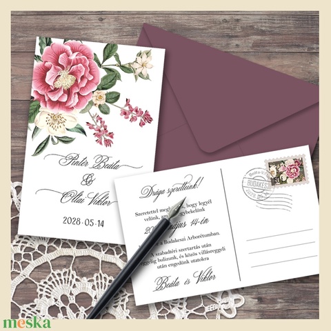 Vintage hangulatú virágos grafikák. Ha kétoldalas formátumot választasz, a hátulja lehet olyan, mint a régi képeslapok, amin van bélyeg, és egy régies postabélyegző az esküvő helyszínével, dátumával és a pár nevével - erre a pecsétre természetesen a ti esküvőtök adatai kerülnek majd (de el is hagyható a meghívóról). Illetve a címzés helyére ráírhatjátok a meghívott nevét is.