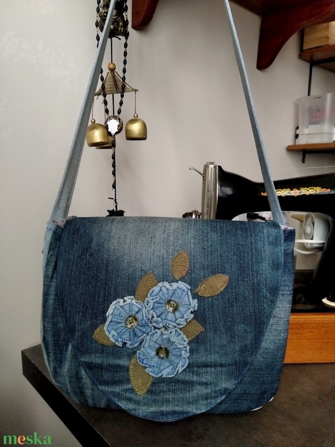 Válltáska farmerből, virágokkal díszítve