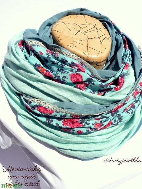 Puha viszkózból és flokon selyemből készült romantikus, gyűrt csősál pöttyökkel, rózsákkal, halvány menta és türkiz árnyalatokkal. Körben egy sor vajszínű csipke díszíti.