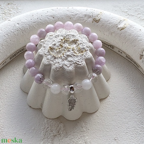 Kunzit ásvány karkötő - tejkvarccal és kristállyal - mikrostrasszos angyalszárny medállal