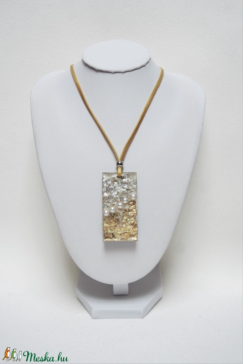 ékszer beton, műbőr szál, szerelék, arany fóliafüst, üveg gyöngyök, ezüst fóliafüst, műbőr