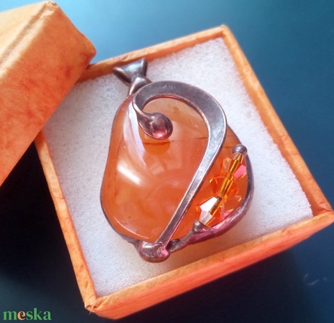 Ez a gyönyörűséges Karneol egy ívet lendületes kapott, amitől látványossá vált. És még három pici üveggyöngy csillog a sarkában