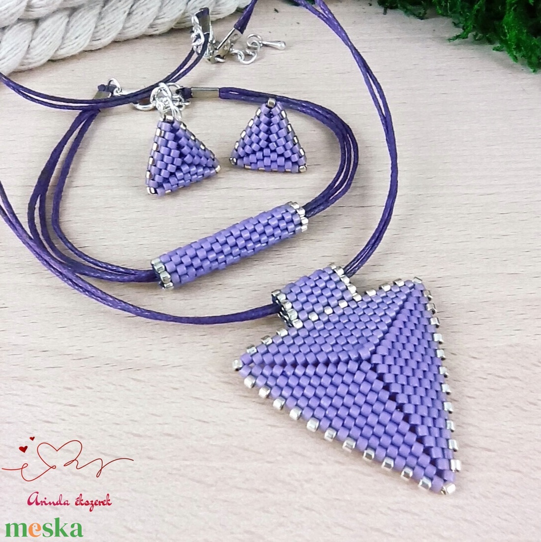Kiváló minőségű japán delicából, aprólékos munkával fűzött nyaklánc-fülbevaló szett. A szett alapszíne sötétlila, szélein ezüst delicával díszítettem, mely aranyos keretet ad az egyes daraboknak, valamint kiemeli az alapszínt és a motívumot.