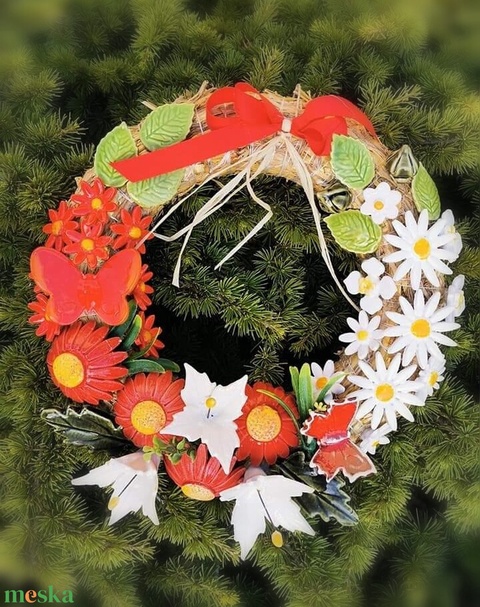 Fehér agyagból aprólékos kézi munkával ,szabadkézi formázással készült 2 X égetett mázas kerámia virágok és levelek sokasága .Az elkészült virágokat,leveleket vásárolt szalma alapra ragasztottam.Átmérő;27 cm.(A legszélesebb részén). Nagyon mutatós örök dísze lehet ajtódnak teraszodnak,lakásodnak!Nem fakulnak a virágok a tűző naptól!Boltunkban minden alkotás kész termék így akár azonnal megvásárolható..Személyes átvétel : Bp. XXI.ker .Csepelen lehetséges!