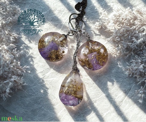 Orgonit és nemesacél ékszer szettet készítettem csaroit, rózsakvarc és hegyikristály ásványokkal, réz forgáccsal, gyantába öntve. A fülbevalók 2 cm átmérőjűek, a medál 2 cm magas, a lánc pedig 50 cm hosszú. Nem okoz irritációt, allergiát.